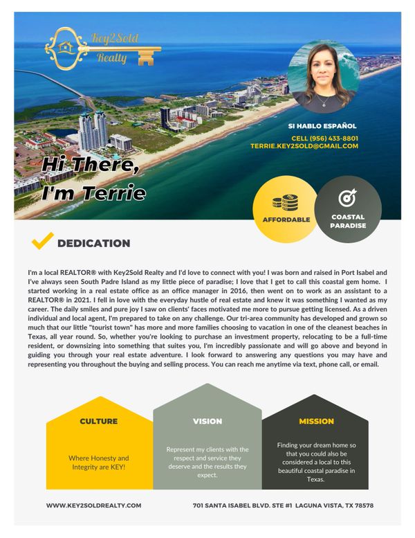 Hi, I'm Terrie. I'm a local Realtor® who would love to connect with you! I was born and raised in Port Isabel, and I’ve always seen South Padre Island as my little piece of paradise; I love that I get to call this coastal gem home.