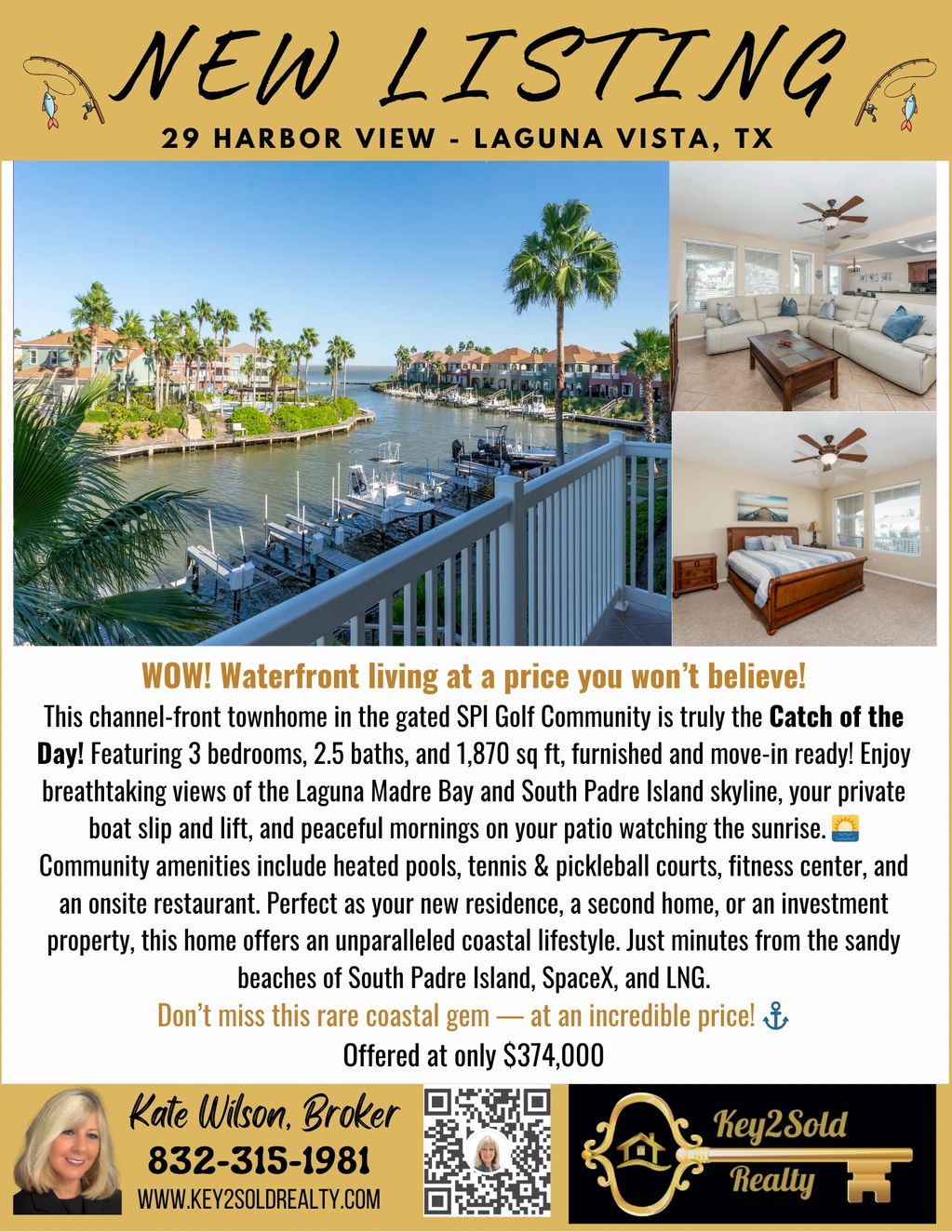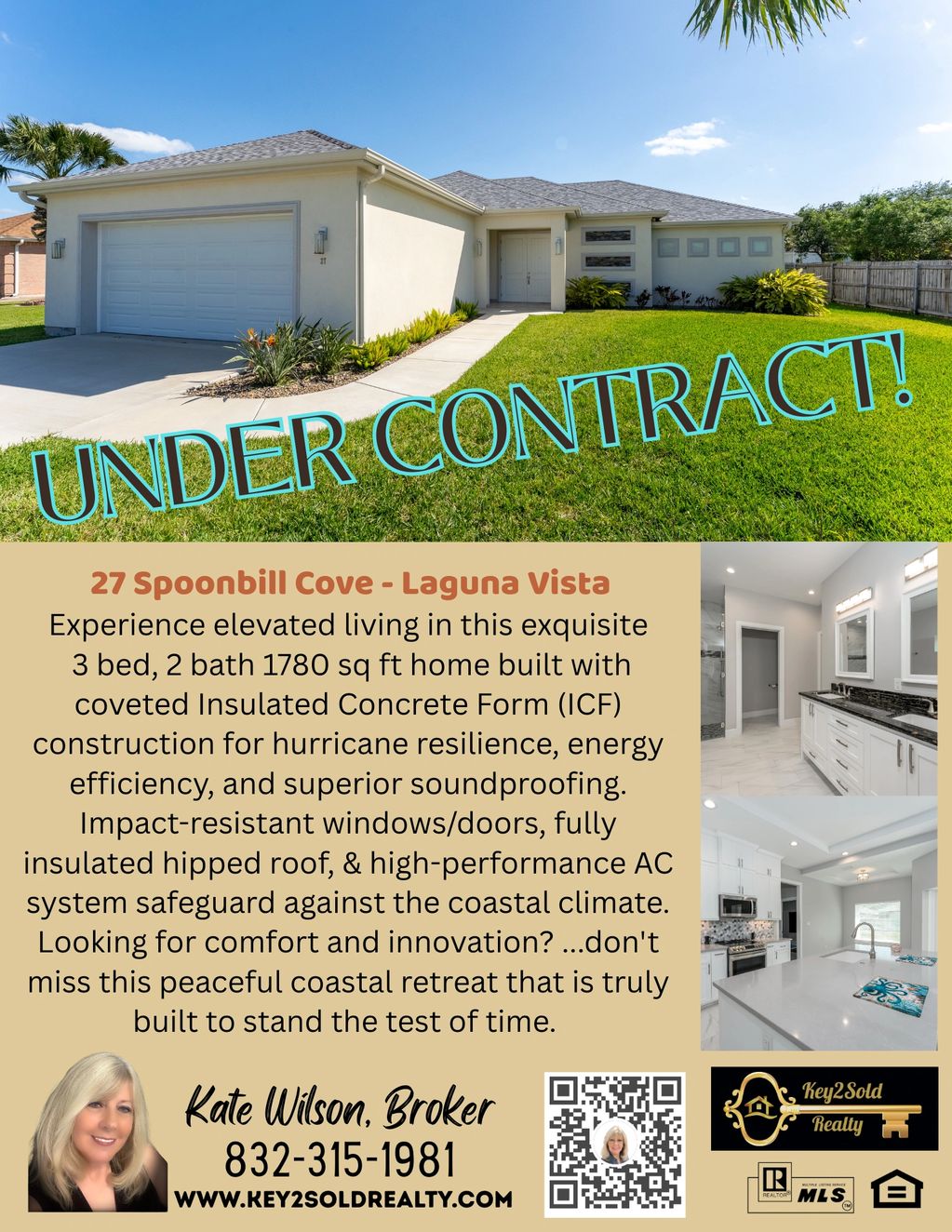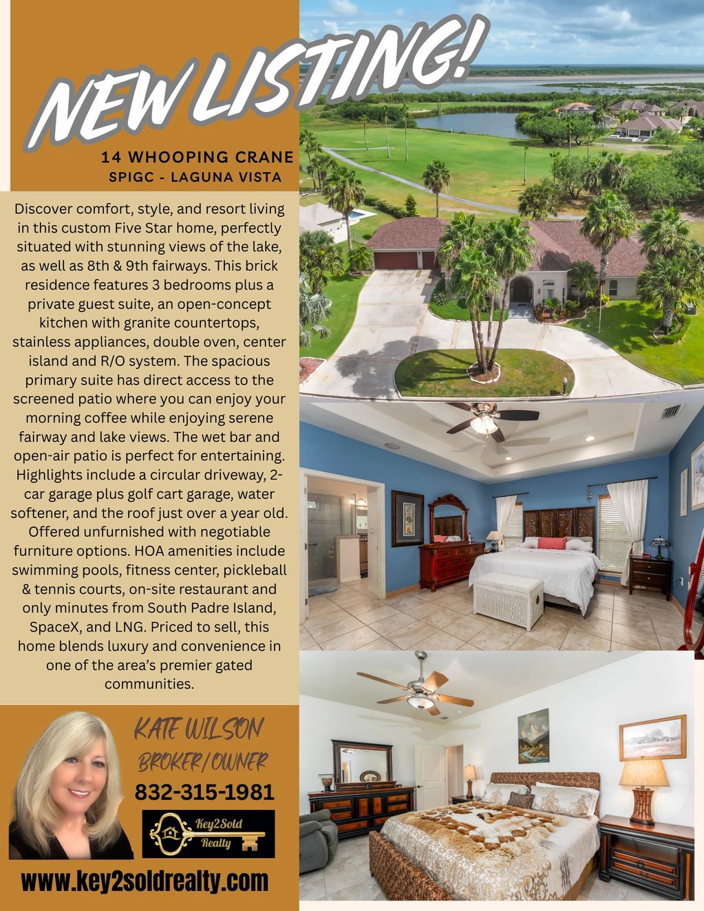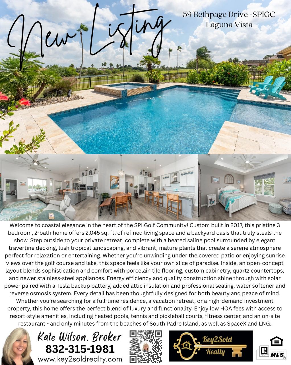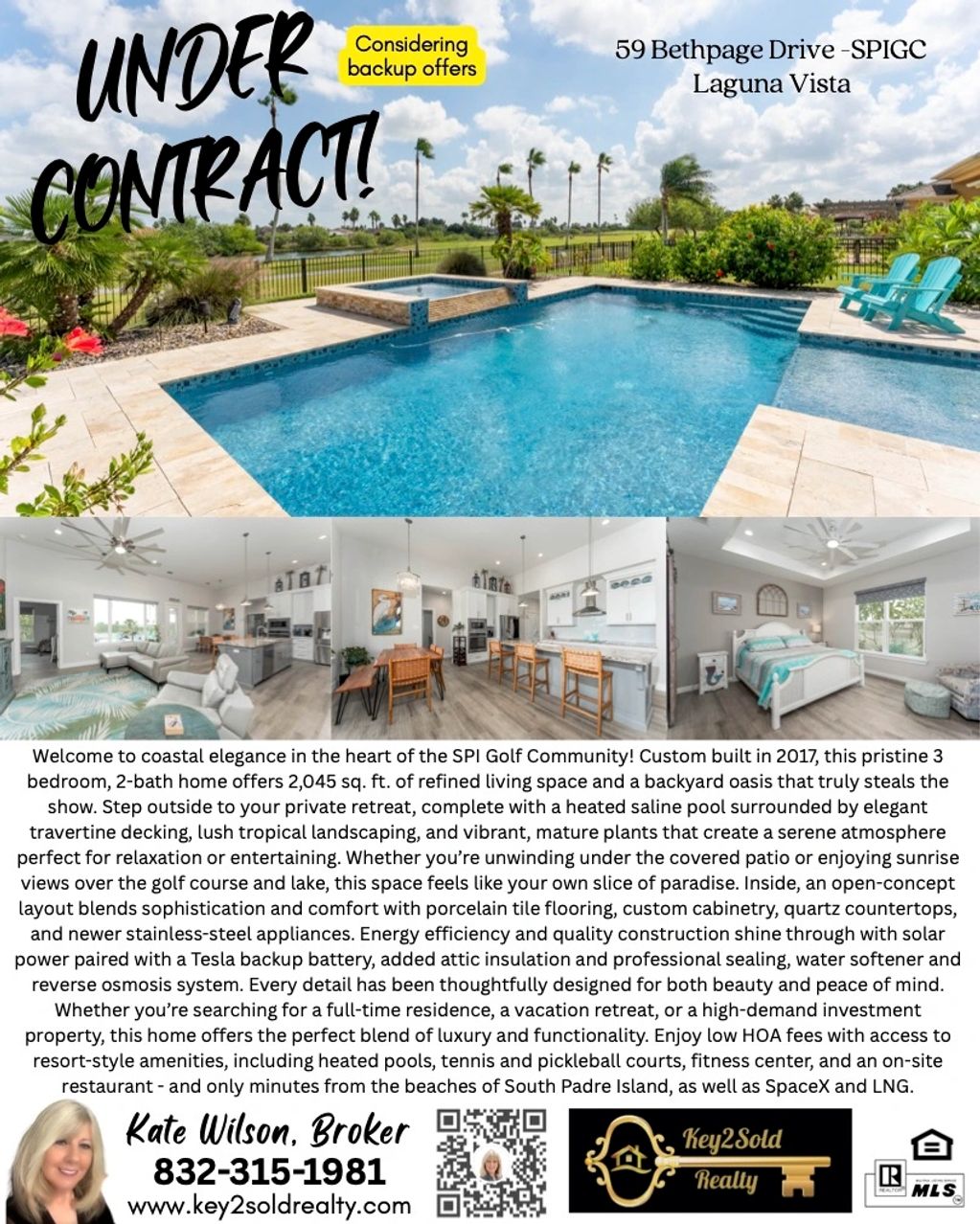 JUST LISTED! Welcome to coastal living at its finest! Behind the gates of the prestigious South Padre Island Golf Community, this custom 2006 Gold Star home offers 3 bedrooms, 2 bathrooms, and 1,763 sq ft of stylish comfort. The open-concept design features freshly painted elevated ceilings, granite countertops, custom cabinetry, and a gourmet kitchen with a reverse osmosis system and water softe